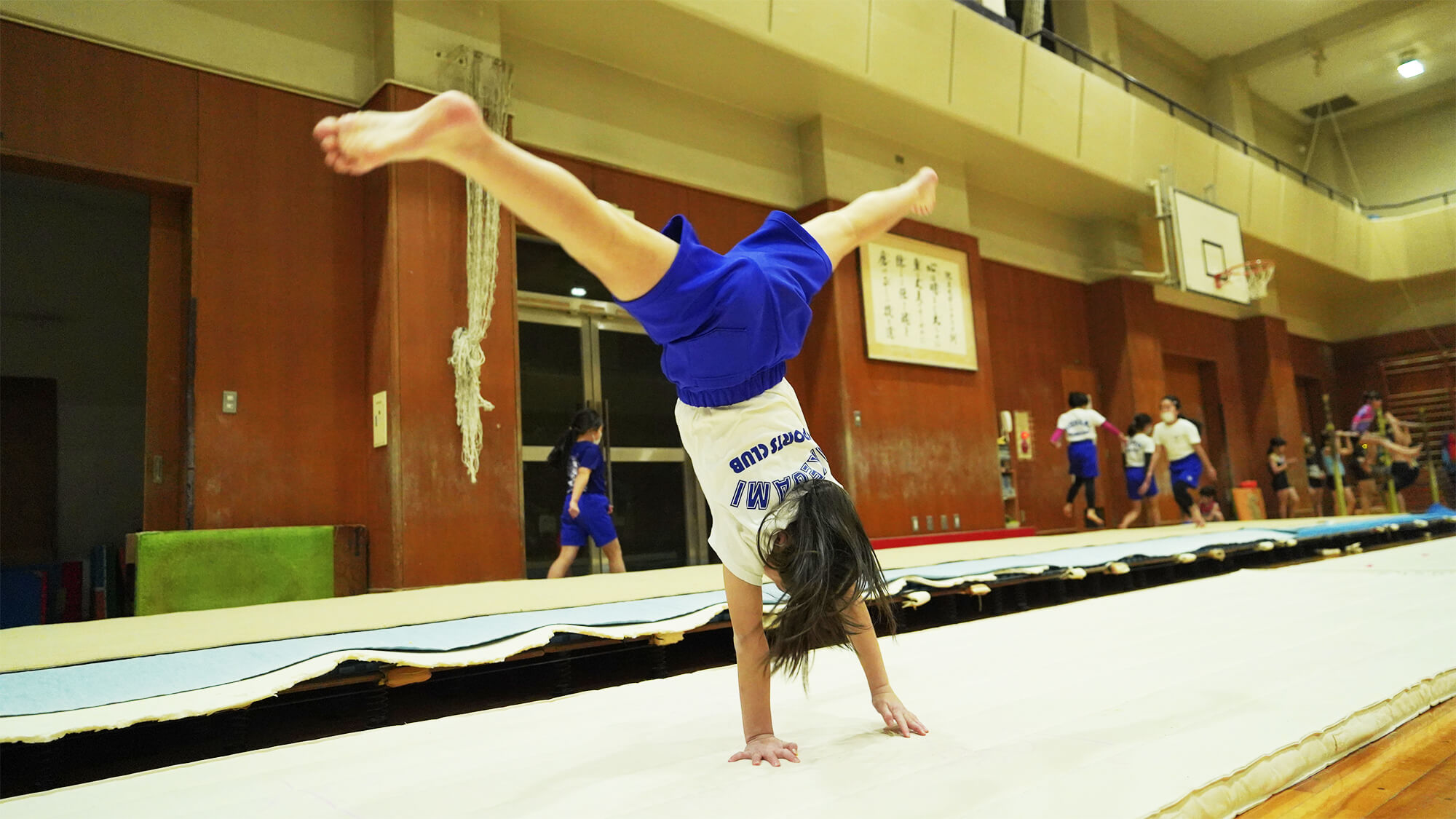 逆上がりが出来れば随時入会することができます。マット、跳び箱、鉄棒を中心に器械体操の基礎から基本技術の習得まで進級テスト基準表に基づいて指導します。